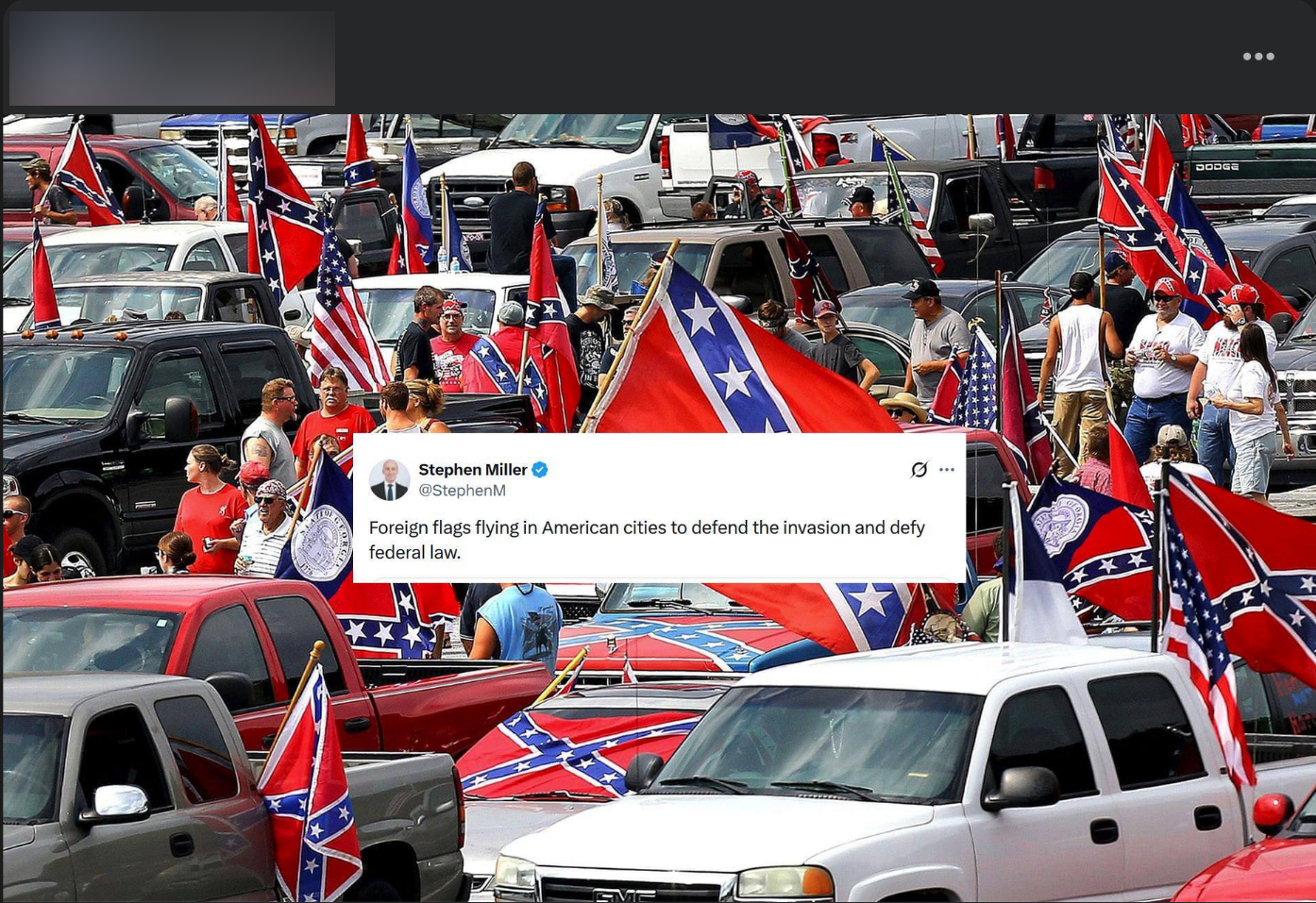 Percival Bertram Thanks for the honesty. Just so we're clear; immigrants protesting with a heritage flag 'don't belong,' but citizens flying a flag that represented the violent destruction of the United States are just expressing distasteful but protected speech. You are not applying the same standard. You're just deciding whose expression offends you more, and disguising that as patriotism. The law protects both. The outrage only targets one. That contradiction still stands.
